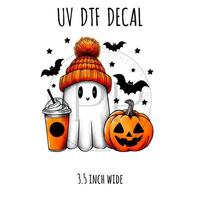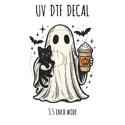 #614 Spooky Cute Ghost Cat Pumpkin Latte- 3.5 inch wide UV DTF decal